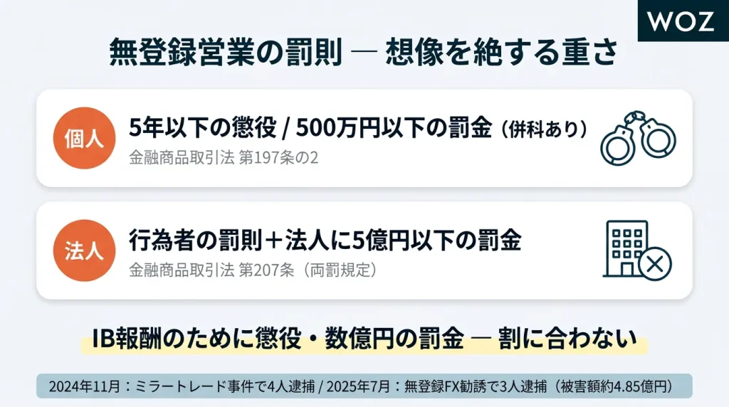 2024年11月には、自動売買システム「ミラートレード」を謳い、投資家から資金を預かりFX取引をしたとして、会社員の男ら4人が逮捕される事件が起こりました。さらに2025年7月には、神奈川県警が無登録でFX投資を勧誘したとして、金融関連会社代表取締役の男ら3人を金商法違反(無登録営業)容疑で逮捕しています。この事件では、34人から約4億8,500万円もの預託金を集めていたとみられています。こうした摘発は決して遠い世界の出来事ではありません。IB業務も同じ無登録営業であり、いつ摘発されてもおかしくない状況なのです。