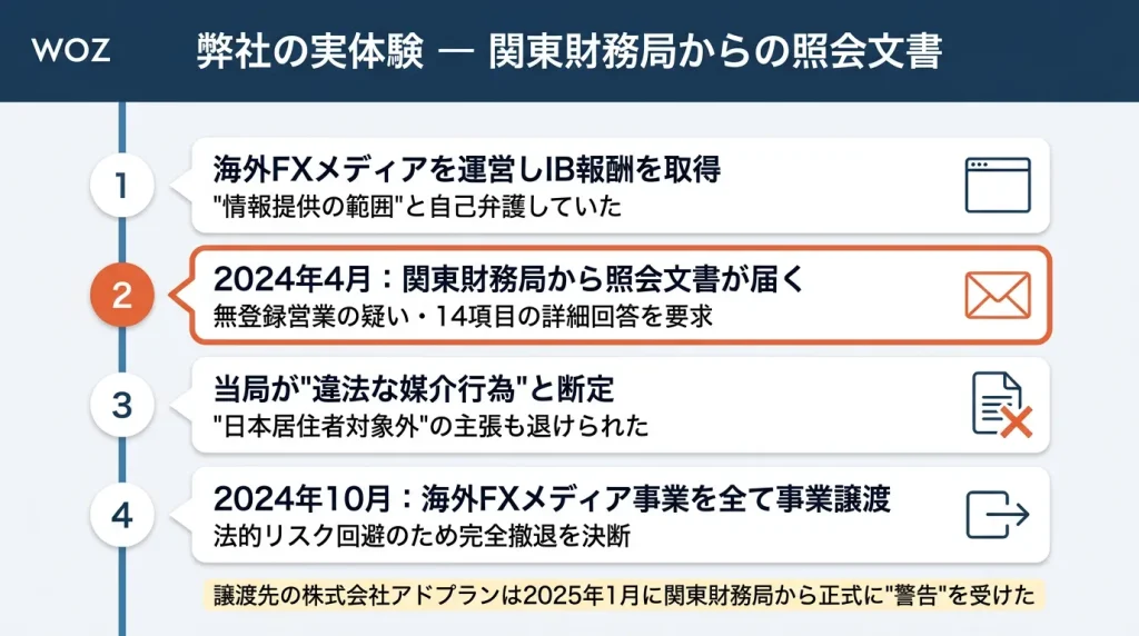 幸いにも弊社は警告を免れましたが、結果的に譲渡先が当局から名指しで違法認定される事態となり、海外FXやIB業務の根深い違法性と、当局の監視の厳しさを痛感しました。