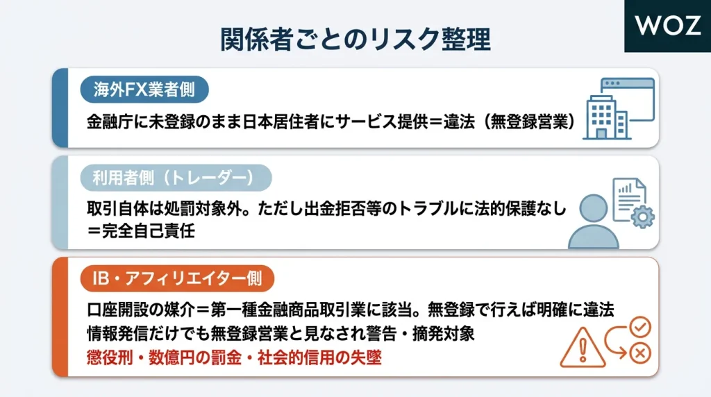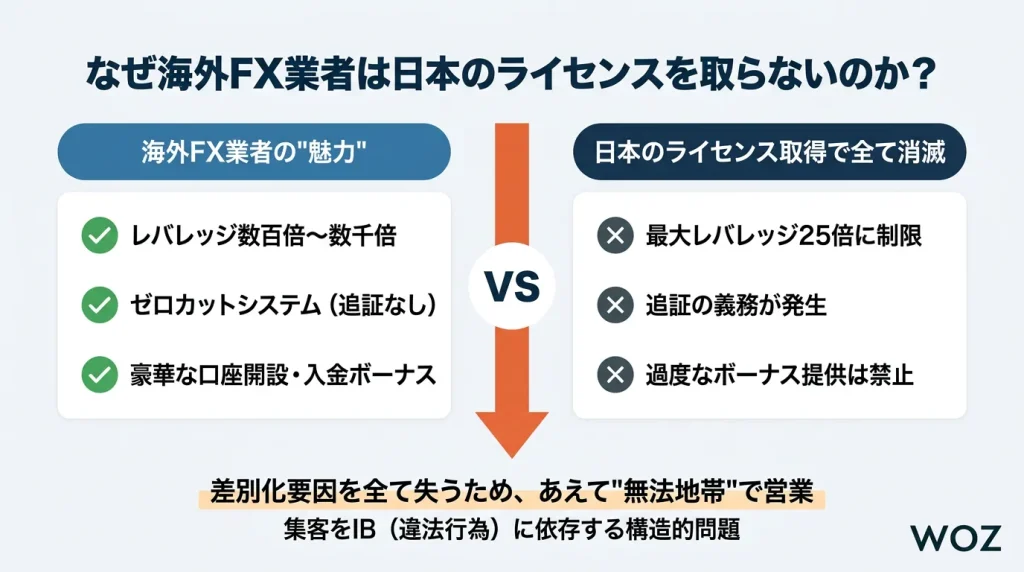 つまり、彼らが日本のルールに従ってライセンスを取得した瞬間、他の国内FX業者との差別化要因をすべて失ってしまうのです。そのため、彼らはあえて日本の法律の外、つまり「無法地帯」でビジネスを行い、その集客を違法行為であるIBに依存している、というのがこの業界の構造的な問題なのです。