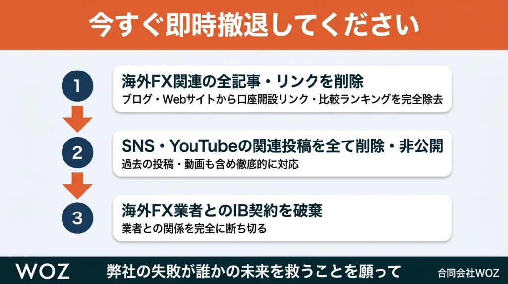 - ウェブサイトやブログから、海外FXに関する記事、比較ランキング、口座開設リンクをすべて削除する。