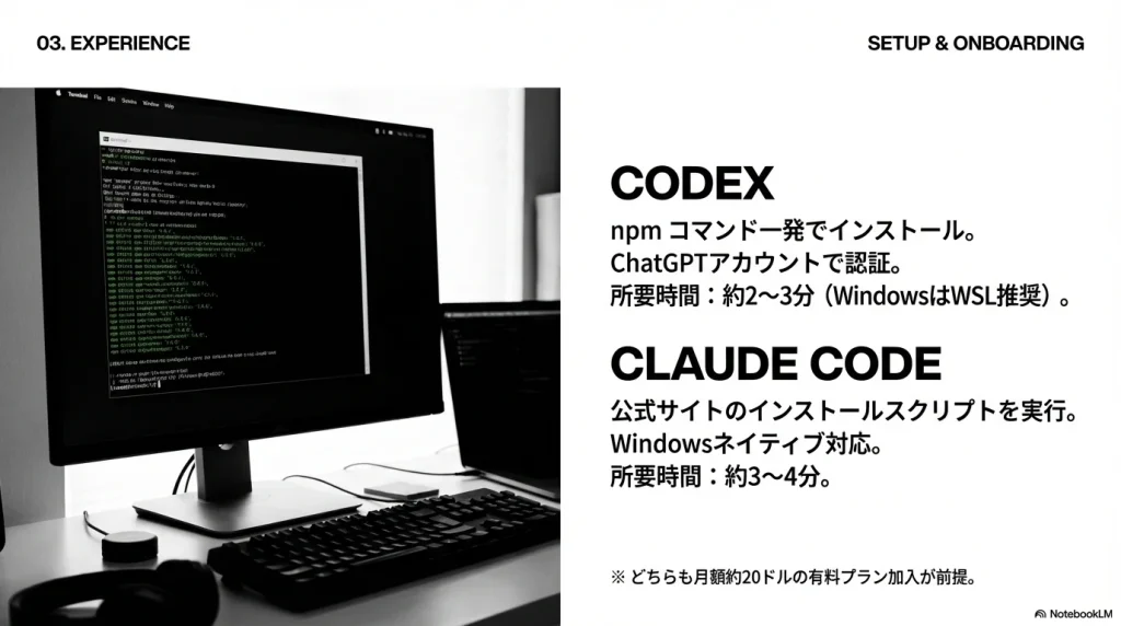 Codexの場合は、npmコマンド一発でインストールできます。その後、ChatGPTアカウントで認証すれば完了です。筆者の環境では約2〜3分で使える状態になりました。ただし、WindowsではWSL(Windows Subsystem for Linux)上での利用が推奨されている点には注意が必要です。