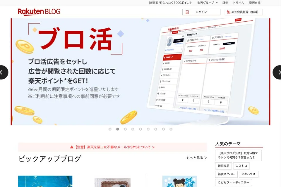 楽天ブログは、楽天グループが運営している無料ブログサービスです。最大の特徴は、ECサイト「楽天市場」との連携機能が充実している点で、楽天ブログから楽天市場の商品を簡単に紹介できるほか、楽天アフィリエイトの設定もスムーズに行えます。商品レビューや購入品紹介など、物販系のブログを運営したい方にとって非常に便利な環境が整っています。